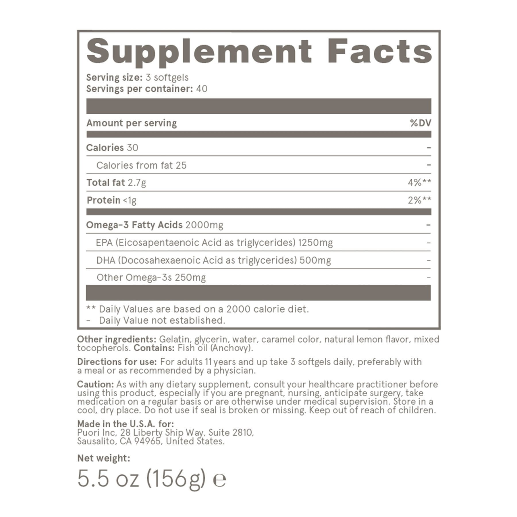 ULTRA PURE: Puori Omega-3 is made from small fish and is molecularly distilled to reduce mercury, PCB and dioxin levels.